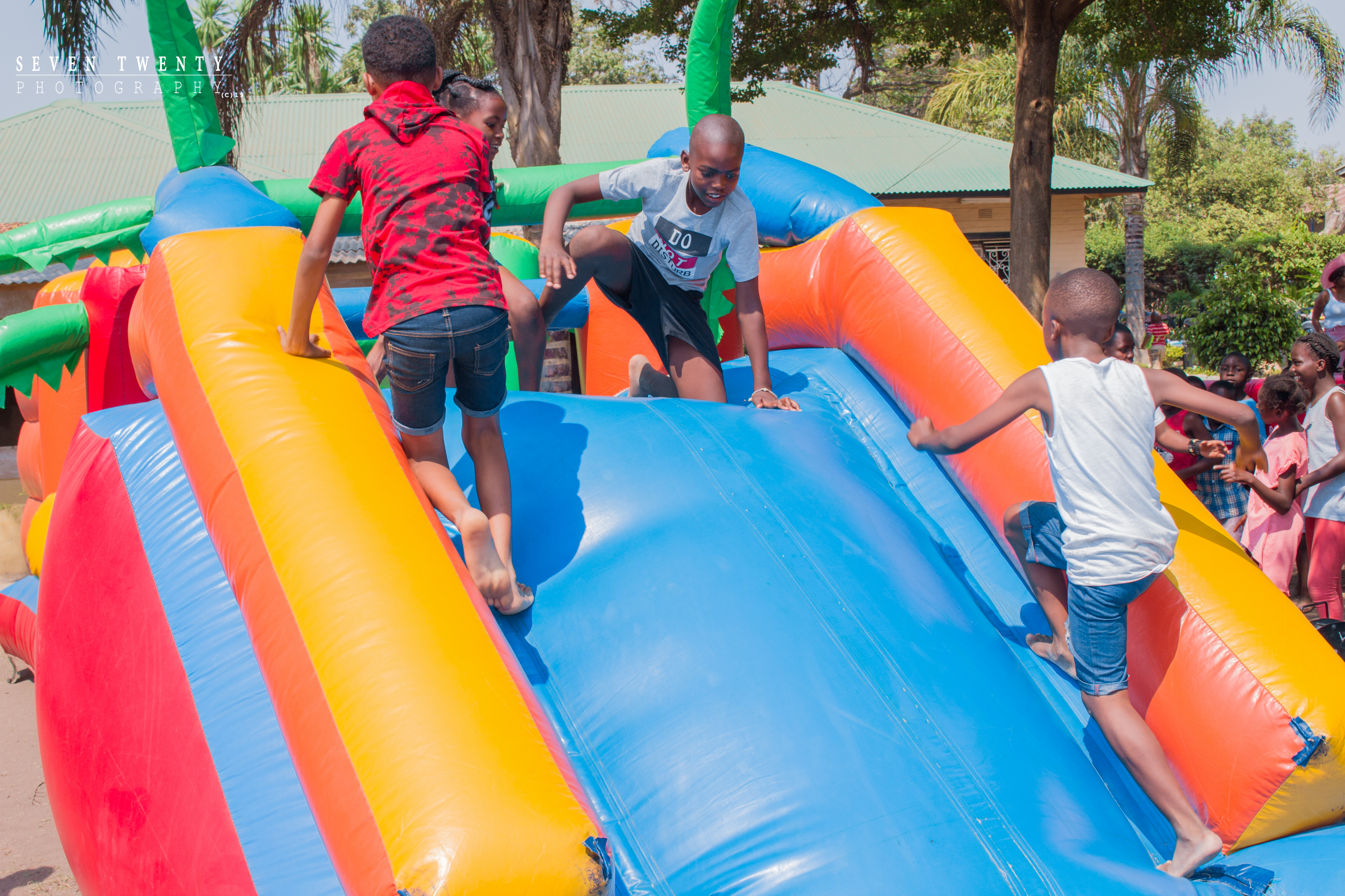 Paint splasing games, water slides, jumping castle, drawing, running, water play